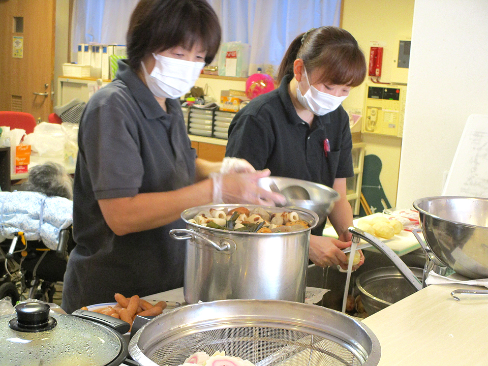 ワクワクした様子で、鍋を覗き込む入居者様達。